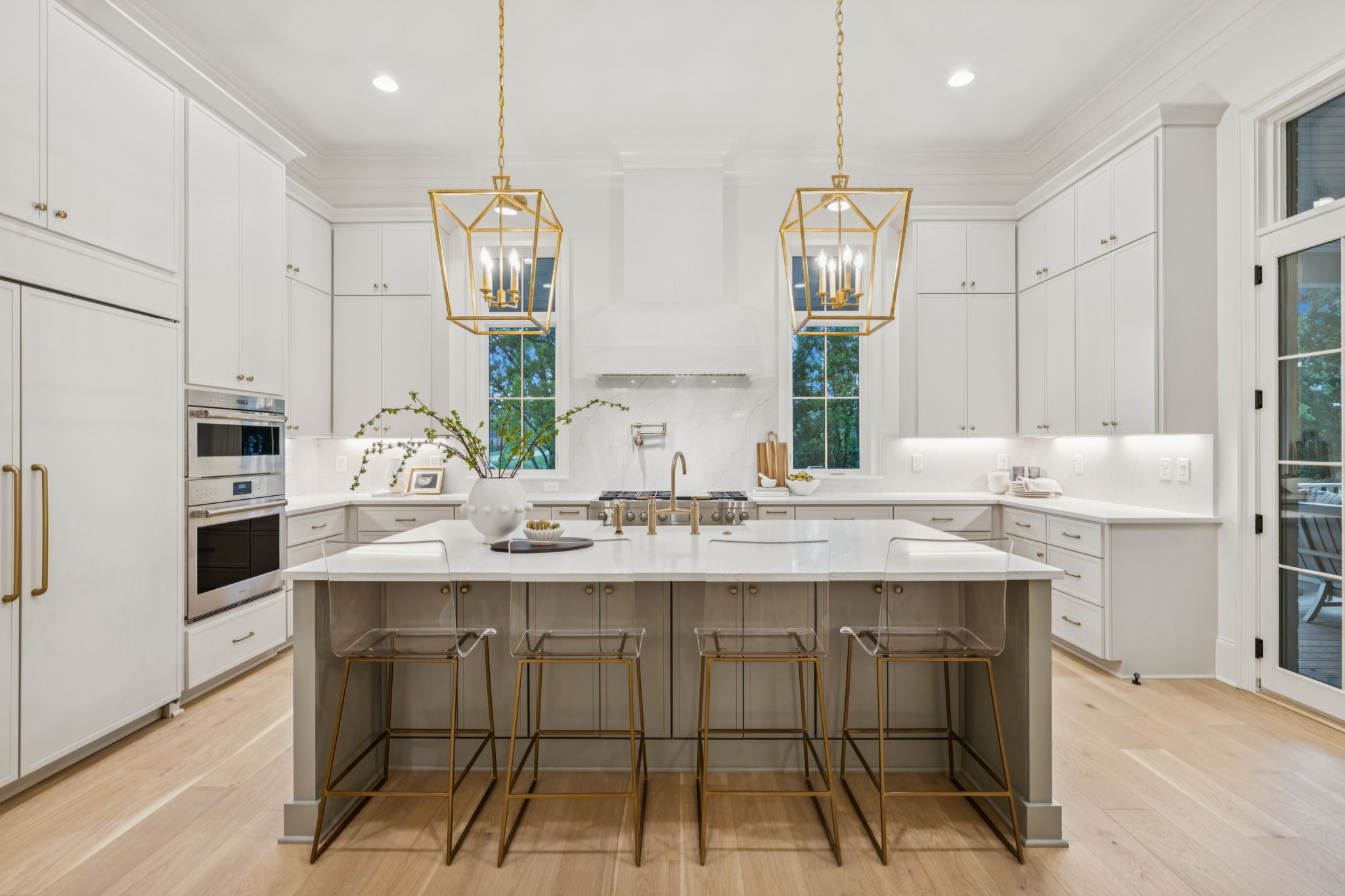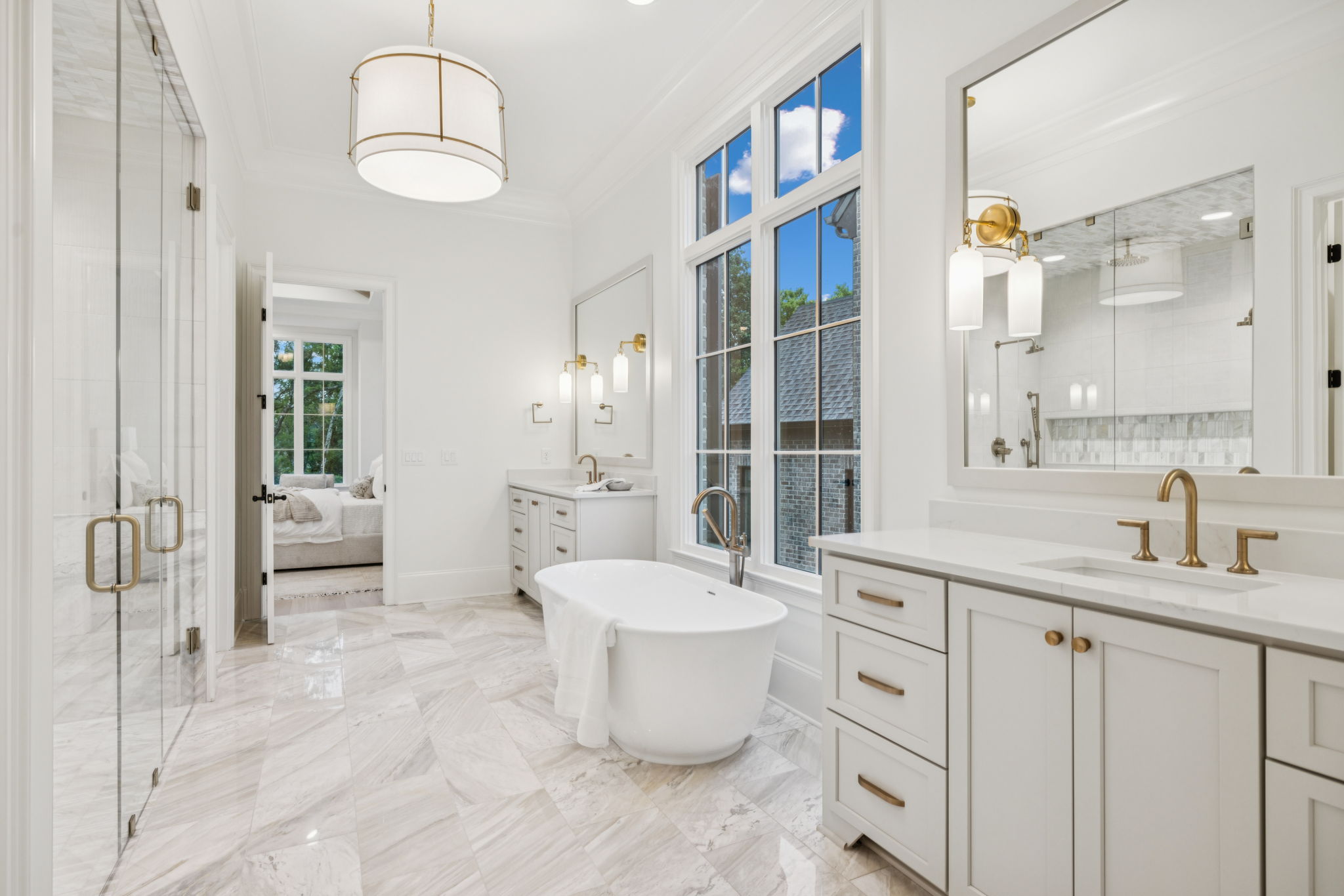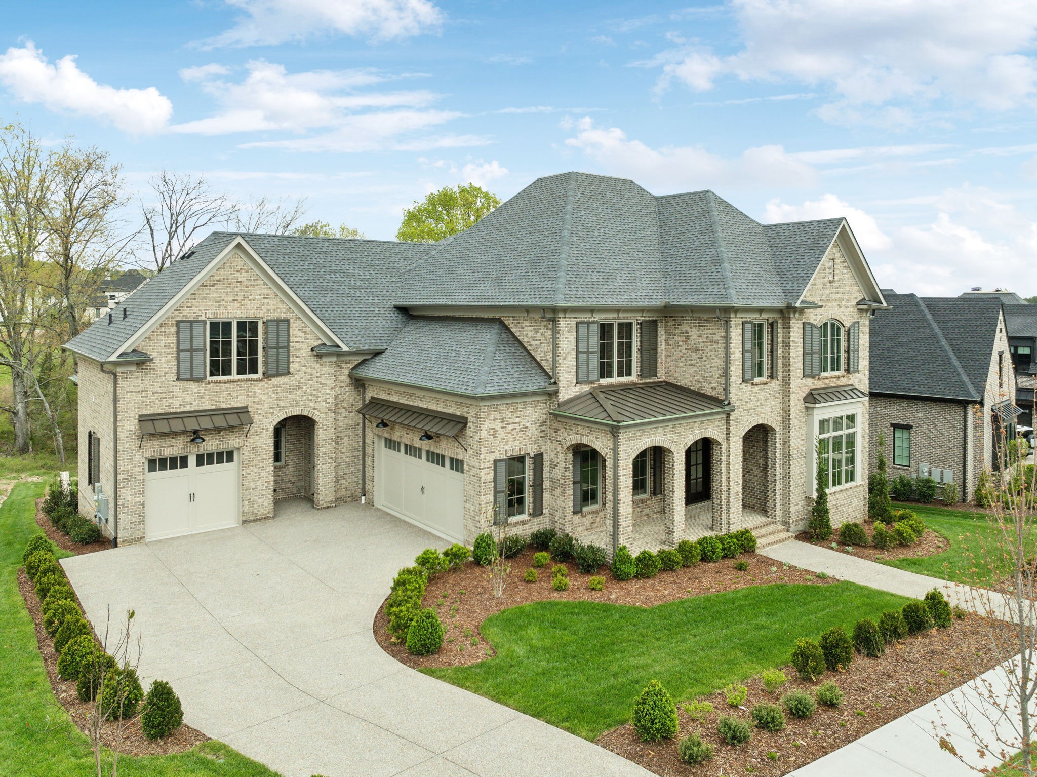This stately 8,924 sq. ft. home is presented by Ford Classic Homes, featuring a magnificent primary suite on the main level with vaulted ceiling and stained beams, free-standing tub, and a large walk-in closet with a full-length mirror plus built-in dressers on either side of the window bench. A wonderful Alexandra floor plan with a Guest Suite plus a Study with crossing beam ceiling detail on the main level. Kitchen with flush island and Dining Room are perfect for entertaining. Great Room with coffered ceiling detail and built-in custom cabinetry to either side of the wood-burning fireplace leads out to two covered deck areas. One deck has a wood-burning fireplace, and the other has a built-in grill. The upper level has 3 ensuite bedrooms, Game Room, Flex Room, Finished Storage Room, and Bonus Room with a wet bar opening to an expansive Sun Deck. The basement features the sixth bedroom, two full bathrooms, a Kitchenette, Billiard Room, Media Room, Exercise Room with a wall treatment and drop zone, two covered patio areas, finished storage, and a future wine cellar. 3-car garage! Elevator services all three levels, so it makes utilizing all of the floors a breeze. This home backs up to trees and a creek! This home is just a short distance from the Bridge Bar, Tennis/Pickle Ball courts and swimming pool in The Gathering Place.
